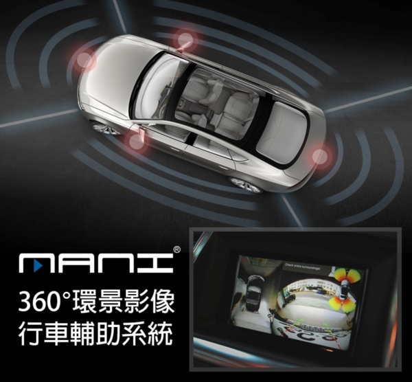 除了在意的美觀外,最重要的就是功能與操作,MANI環景影像行車輔助系統畫質高達720P,經由四個位置的鏡頭 (水箱罩、左右後照鏡、車尾) 所拍出畫面,透過即時高速運算無縫拼接成清晰不變形的畫面與鳥瞰圖,即拍即錄的影像也可以直接由螢幕操控迴放觀看。