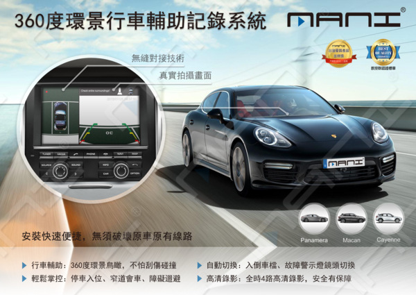 市面上行車紀錄器琳瑯滿目,想要安全有保障,許多人選擇前後各裝一台,卻因此遮蔽後方視線、破壞美觀。睿智杰(MANI)推出Porsche專用360度環景行車輔助記錄系統,無須破壞原車原有線路,有如原廠配件美觀不失質感,並帶給您360度的安全防護。目前適合車款有Panamera系列、Macan系列、Cayenne系列等。