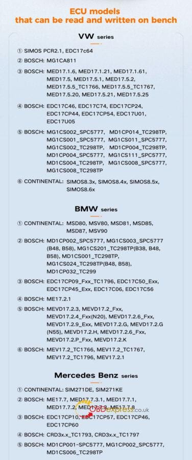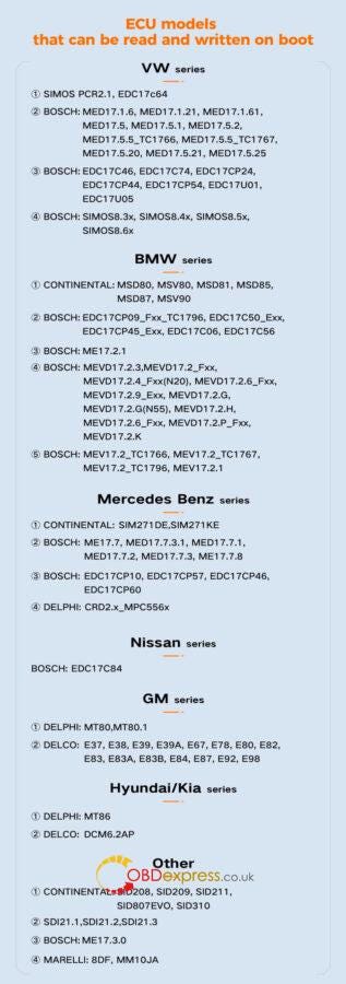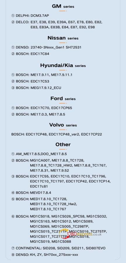 - 博世:EDC17C46、EDC17C74、EDC17CP24、EDC17CP44、EDC17CP54、EDC17U01、EDC17U05
