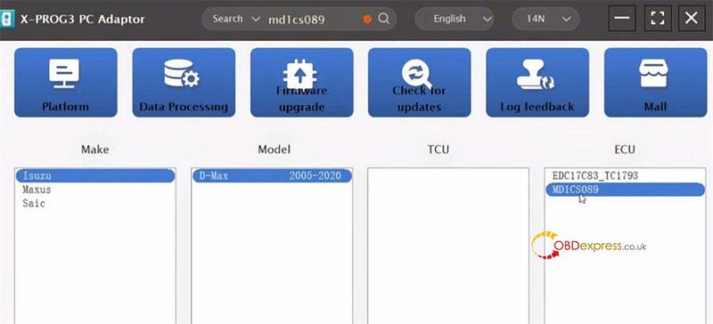 在搜尋框中輸入「md1cs089」以尋找對應車型(Isuzu D-Max 2005–2020 MD1CS089 ECU)