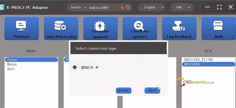 經測試驗證, LAUNCH-X431 X-Prog3 帶 PC Adapter 可以在 Bench 模式下完美克隆 ISUZU Bosch MD1CS089 ECU。不需要X431 平板電腦。