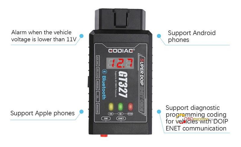 GODIAG GT327 SUPER DOIP ENET OBDII ELM327v1.5 全面掃描器 支援藍牙和 DOIP 連線。專為汽車維修技師、DIY維修人員開發。它可以透過藍牙與Android和iPhone智慧型手機一起使用,進行汽車OBDII診斷。此外,它還可以透過乙太網路線連接到計算機,並與DOIP和ENET車輛專用診斷軟體配合使用,進行診斷編程和編碼操作。