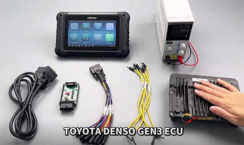 - 準備 OBDSTAR DC706 主機、主電纜、OBDSTAR P004 轉接器、ECU 克隆跳線、12V 電源和豐田 Denso GEN3 ECU