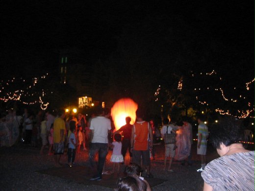 晚上的兩個重頭戲一是烤肉,一是放天燈。烤肉的材料十分豐富,農場為我們準備的十人份和別人一樣多,但因為有四個小孩,所以我們還剩下很多可以分送給別人。我比較喜歡的是放天燈這個活動。由於每個家庭都必須自己製作天燈,而且在上面畫畫許願,所以大家放起來特別興奮。當我們的天燈緩緩升起,我們大家都拍起手來。也有人製作的天燈不良,飛到一半就燒起來了,媽咪也說好運旺旺來。Anyway,放玩天燈之後我很興奮的邀老爸泡茶,沒想到幾杯茶下肚竟讓我興奮地睡不著(待續)。
