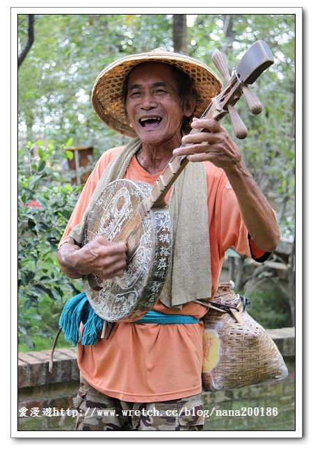 園區中有個郵差生涯退休到這裡當志工的〔村哥〕,不但多才多藝,為人相當可愛,練就各式各樣的樂器,還能騎單輪車雜耍,最後應Carrie的要求穿著蓑衣戴著斗笠(蓑衣斗笠是台灣傳統農村雨衣),彈月琴唱民謠,真的是很棒的國寶級人物!