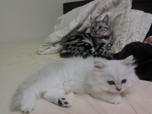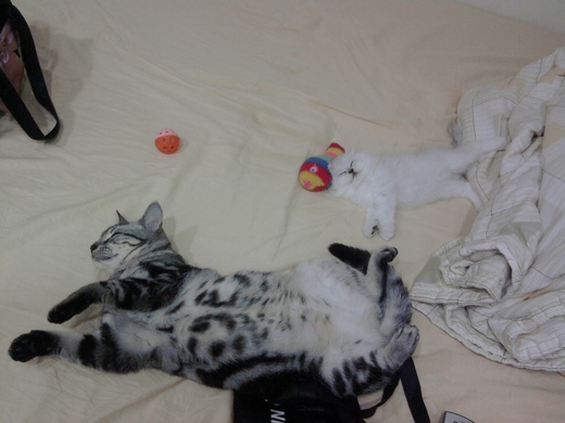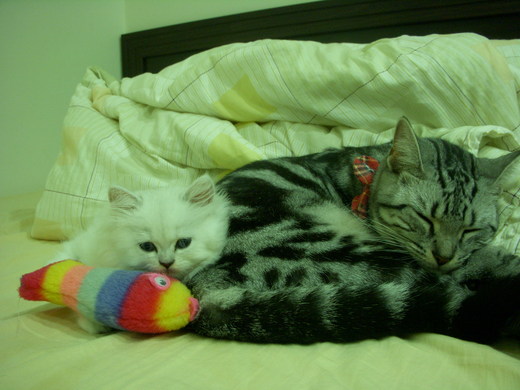 天氣變涼了~喵喵們又要進入捲圈狀睡覺的季節,miu miu從對球球哈氣變為偶爾撲咬階段..只有睡覺時..才對她像照片中醬nice互相依偎,