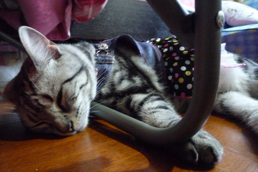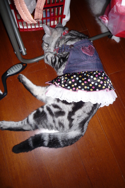 我買這件她大概幾小時內就能鬆脫它..所以也算穿不住型!前幾天較冷又下雨想說剛好可穿保暖..沒想到我出門回來後..它已經橫躺在陽台上了..因為我出門時miu在陽台晒太陽..睡午覺...可見她睡醒就脫掉衣服了..(也許太熱..