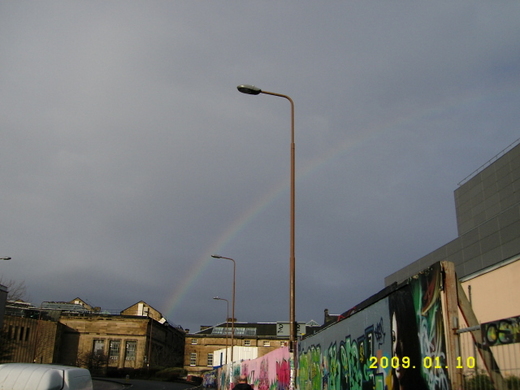 在下著小雨但不很冷的早上和Laura到Royal Mile上的一間教會作禮拜。通常,作完禮拜後我們會找個地方一起吃個簡單的中餐,像是bagel或濃湯加雜糧麵包之類的。但今天我們去了一間Laura推薦的餐廳,在去餐廳的路上看見好大的一道彩虹,這好像是我第一次在愛丁堡看到彩虹,我當作上帝對我說生日快樂。