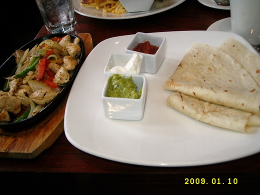 我點了一份Fajita(加入洋蔥、青椒等燒烤的雞肉,用墨西哥麵餅tordilla夾著吃),三種沾醬我都很喜歡。Laura點了英國名菜Fish & Chips,魚看起來炸得鮮嫩多汁,但似乎沒加tartar sauce吃起來就完全沒味道,Laura說英國菜的特色就是儘可能地把食物變得tasteless。