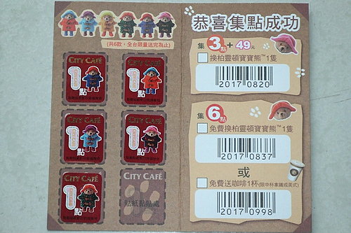我有一張柏靈頓寳寳熊集點卡,只要集滿六張印有熊寳寳的貼紙,就能免費兌換一隻真正的柏靈頓熊寶寶!不過,牠只有10公分大,而且兌換的款式不能自己選擇,得看運氣!
