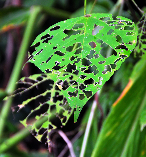 蟲蛀的葉,千瘡百孔,猶如妳破碎的心,世上沒有過不去的事,只有過不去的心。