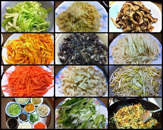 十樣食材分別是:芹菜、客家酸菜心(要挑道地的客家酸菜,不然影響酸香氣和脆度)、香菇、金針菇、木耳、冬筍、紅蘿蔔乾、百頁、黃豆芽和蒜苗。看似普通的十樣蔬菜,卻「搞工」的像在做大菜一樣,總要全家出動,花時間處理食材