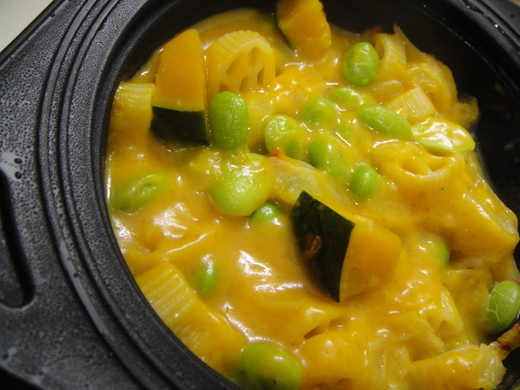 『博士鷹車輪麵南瓜奶油』,南瓜奶油醬汁的色澤鮮美,加了鮮奶、毛豆仁、洋蔥、蟹絲和南瓜等食材,乳香中帶有南瓜淺淺的清甜味,滿不錯吃的。