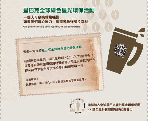 係金a!既響應環保,又有免費咖啡可品嚐!積極推廣環保的統一星巴克,又有大動作!為號召更多人響應星巴克所推廣的紙杯減量環保行動,4/15當天,顧客只要自行攜帶可重複使用的隨行杯,即可免費享有中杯(12oz)的每日精選咖啡,該活動預估可吸引將近20萬的消費者,與星巴克一起共同愛地球。
