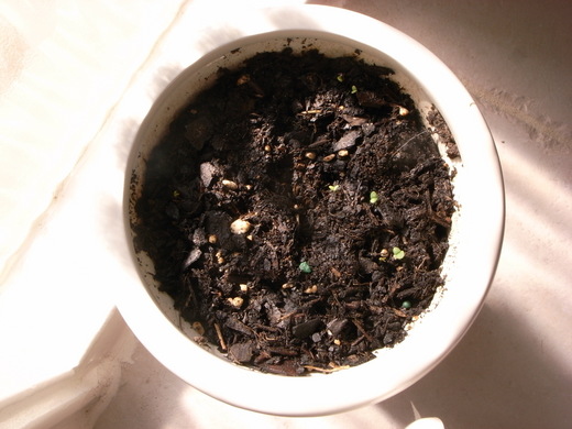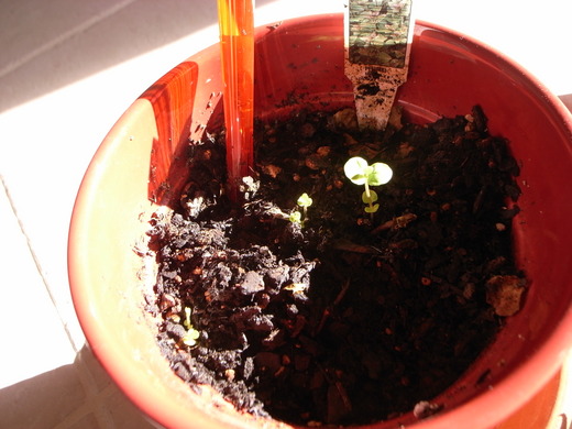 下圖: 同時我前幾天才灑下種子的九層塔也冒出小芽來了... 可說是一線生機, 雙喜臨門啊.