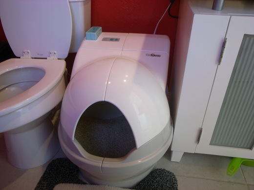 之前試用過二家不同的自動便盆 - 也就是在設定時間裡, 它會自己挖貓砂. 只不過它會把貓砂挖到便盆前的一個盒子裡, 你還是得把盒子每三天就拿出來丟掉. 而且, 砂子老是會掉到盒子下. 還好在陽台上, 不然實在很難清理.