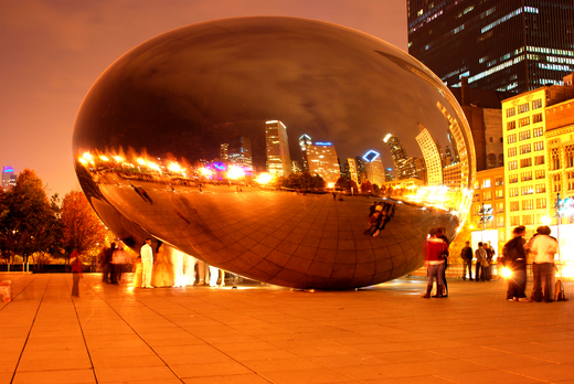 圖1: 我拍的芝加哥天際線, 圖2: 也是天際線, 可惜白天的雲太多, 圖3: 千禧公園裡的巨豆