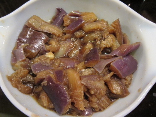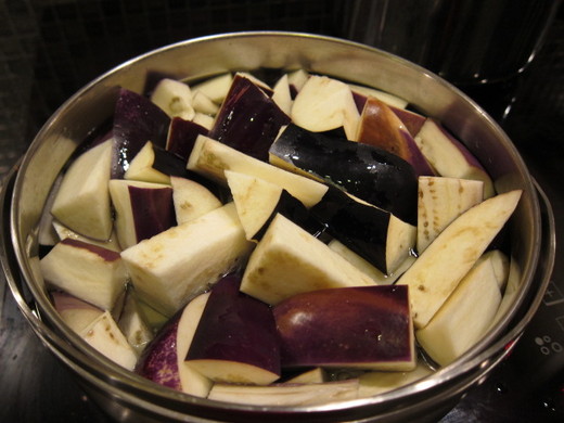 2. 然後將茄子放入滾水中續煮..轉中火, 蓋上鍋蓋, 保持水滾 ( 此一動作是為了避免茄子在水中接觸到空氣)