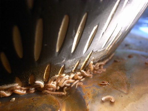 圖1: 盆裡的幼蟲. 圖2: 死掉後, 澆水被沖出盆外的蟲屍, 有的還活著.