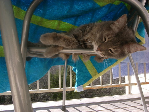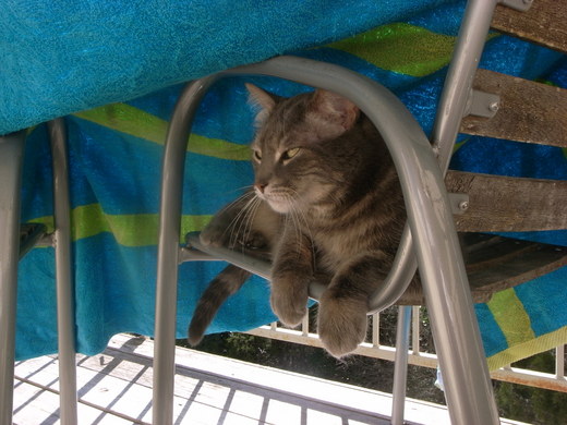 今天剛好天氣非常好, 我把毛巾拿到陽台去曬.... 我一把海灘巾從椅子上拉起, 才發現mew在毛巾下乘涼... 難怪我四處都找不到他...