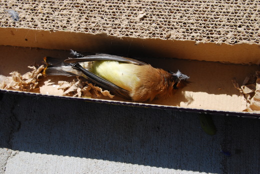 我用手去推推那隻鳥. 它沒有動, 不過, 除了散了一地的羽毛之外, 並沒有看見任何傷口或咬痕. 我把盒子拿出來, 這隻鳥要嘛很年輕, 不然就是母的, 因為它的體型比較小, 而且翅膀尖端並沒有紅色的羽毛.