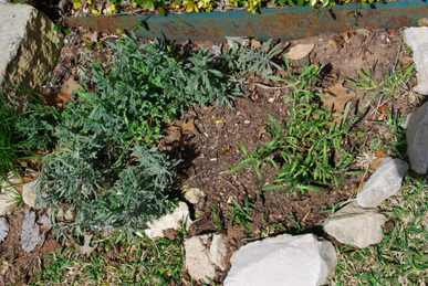 圖二的右邊是2008年秋天時種的羽葉薰衣草, 左邊則是2010年3月剛種下的甜薰衣(攝於2009年3月), 圖三則拍攝於2010年五月. 這個角落的土壤是有點類似粘土, 不過, 薰衣草只是長的比較慢一些, 還不至於死亡.