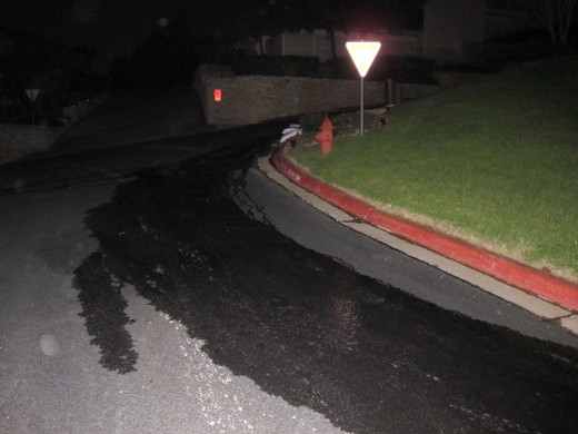 上週末晚上11點, 我先去去倒垃圾, 經過他家車庫, 看見水一直源源不絕的從他的車庫中(圖二及圖三)流出來. 他敲了老半天的門, 也沒有人應.