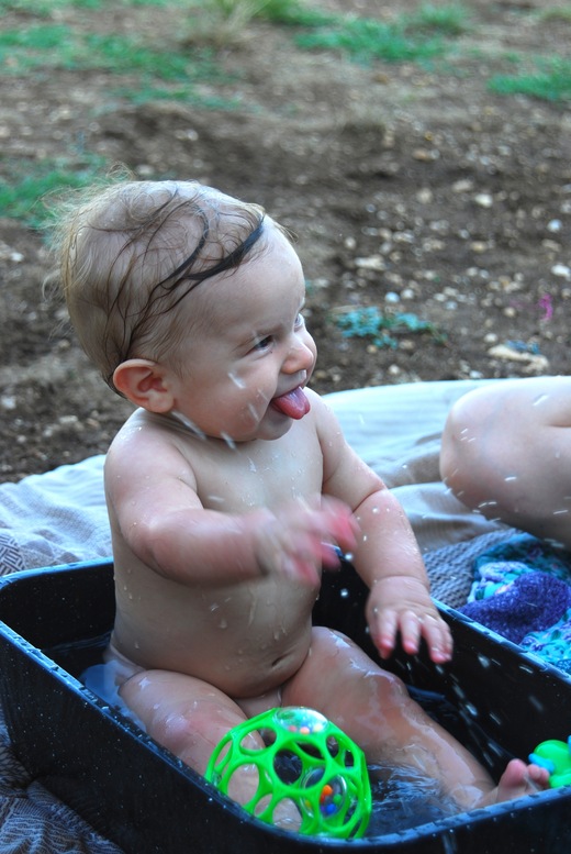 圖二, 圖三: will坐在小水盆裡玩水的樣子.