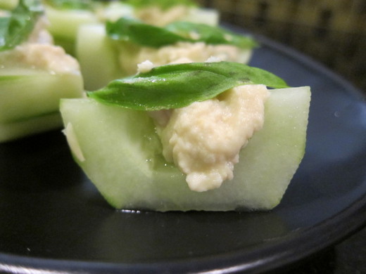 圖一: 做好的hummus, 左邊的比較泥狀是比較正常的. 右邊的比較乾, 得再加點水(煮豆子的水)才行. 圖二: 其它材料. 圖三: 去皮小黃瓜挖空後加上一小匙的hummus及一片巴西里葉.