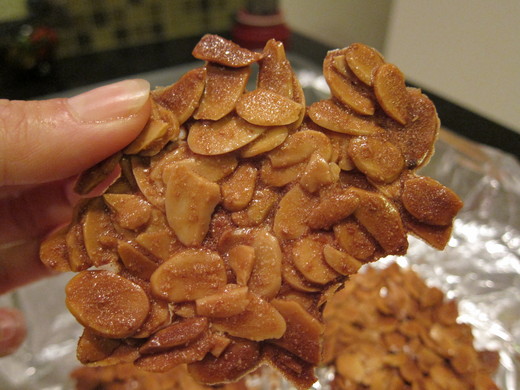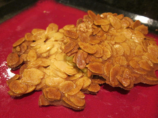 我用錫箔紙當底, 這次做出來的杏仁瓦片真的是滿成功的. 不過, 杏仁片要慢慢推平, 好費工喔... 有比較快且方便的方法嗎?
