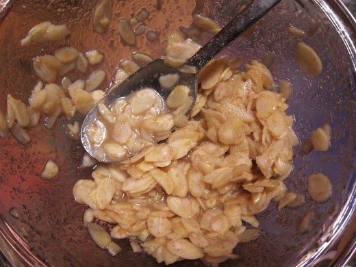 2. 把杏仁片加進去,輕輕拌勻。不要太用力以免把杏仁弄碎。