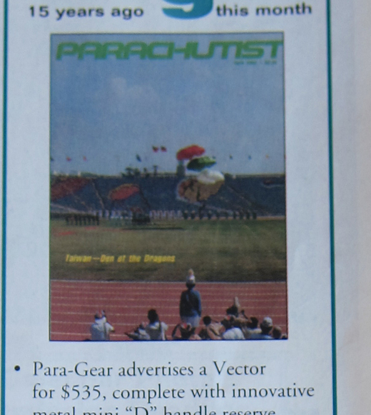 有一次我看到一本1977年出版的雜誌, 裡面刊了跳傘服的廣告(一件70美元), 現在一件跳傘服大多250元起跳. 這本雜誌已經有點年紀了是1998出版的, 我隨意翻看, 想看看有沒有什麼會讓我覺得驚訝的事.