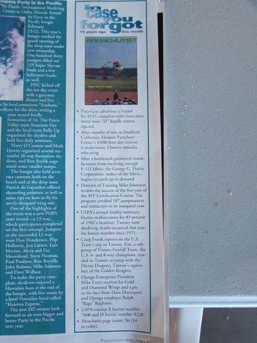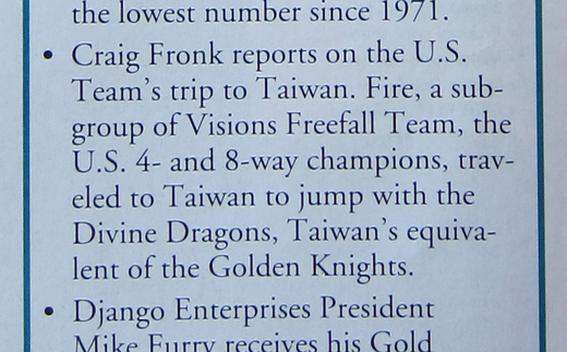 九月中到亞利桑那州參加200人跳傘活動時, 無意間看這一本跳傘雜誌. 這本跳傘雜誌是美國跳傘協會辨的, 每個美國跳傘協會會員每個月都會收到一本.