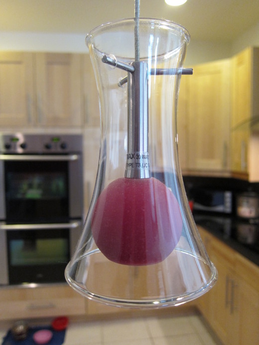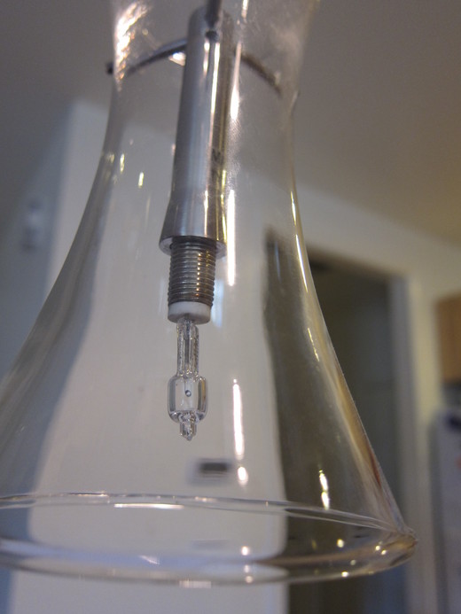 可能那個燈泡是瑕疵品, 過沒三天, 它居然不亮了... 一想到所有的麻煩, 我就想放著不管. 但是放著一天, 我就已經受不了了. 尤其是我們家的吧枱餐是天天用, 一天至少用個四小時以上(早上是為照明, 晚上則是裝飾用).