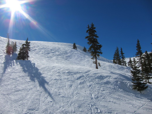 A Basin滑雪場較小(6 - 8座纜車), 對外來客比較沒什麼吸引力. 且A Basin附近沒有可住的地方, 沒ski in ski out的旅館. 好處是它的海拔較高, 雪況通常比其它滑雪場好. 又因雪場小, 票價相對便宜. 它的地形造成大部份滑雪道都很難. 這個滑雪場的綠色道(最簡單的)可和其它滑雪場的藍色道媲美喔.不喜歡刺激的初級滑雪人, 千萬不要來這裡自己嚇自己. 這是我和優亞最常來的滑雪場, 他只滑雙黑鑽, 不願意去Keystone或Breckenridge人擠人.