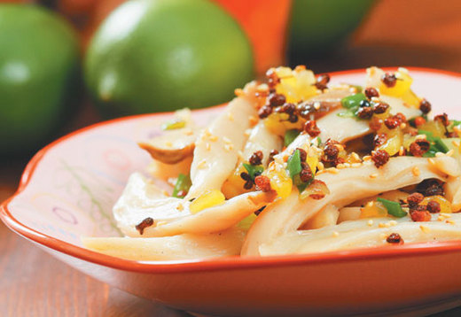 材料:杏鮑菇300克、白芝麻1小匙、蔥1根、花椒2小匙、油1/2 大匙、鹽少許、香油少半、鳳梨果醬1大匙