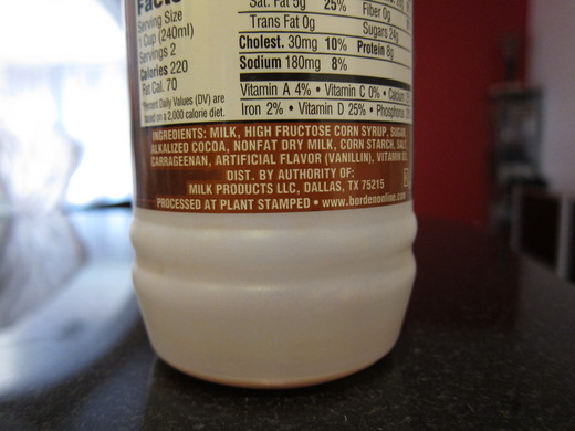 一口氣喝完後, 才想到看它的材料. 除了牛奶和巧克力之外, 它還添加了: 玉米糖漿High fructose corn syrup, 白糖 Sugar, 無脂奶粉Nonfat dry milk, 玉米粉 Corn starch, 塩salt, 海藻抽取物carrageenan, 人工香料 artificial flavor (vanillin), 唯它命D vitamin D3.
