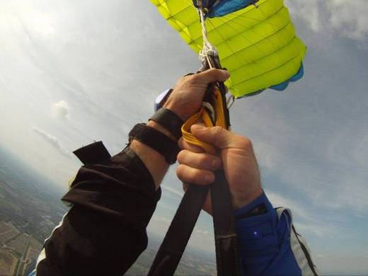 我看看高度器, 1200英呎... 哇~感覺自己實在是太厲害了. 我在短短1000英呎**內解決了五個問題(主傘麻花, 主傘快速旋轉, 主傘無法解脫, 副傘卡在攝影機上, 副傘麻花), 然後還有時間找我的降落地點. 安全降落後(當然是沒跌倒), 馬上有車來接我...