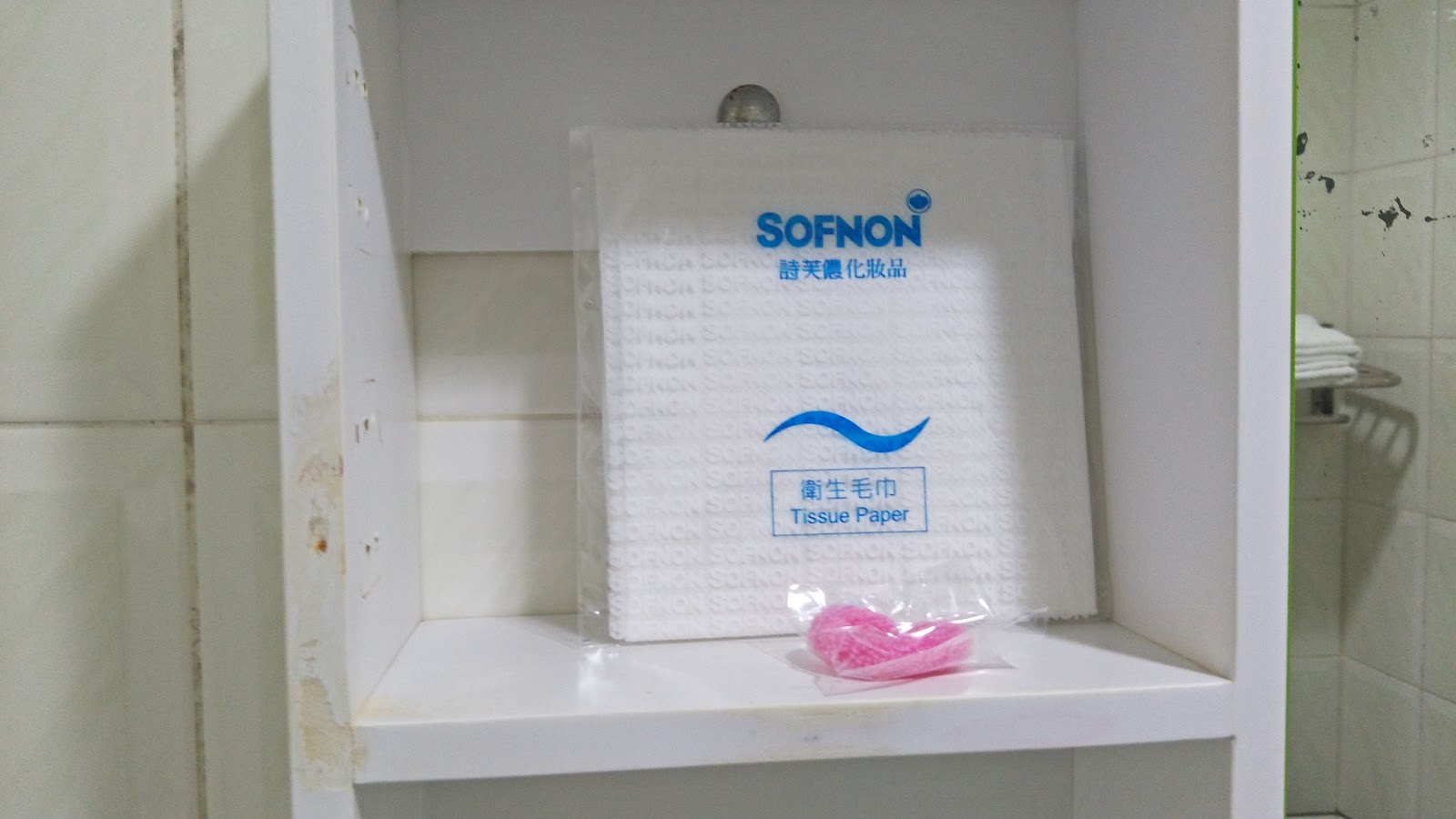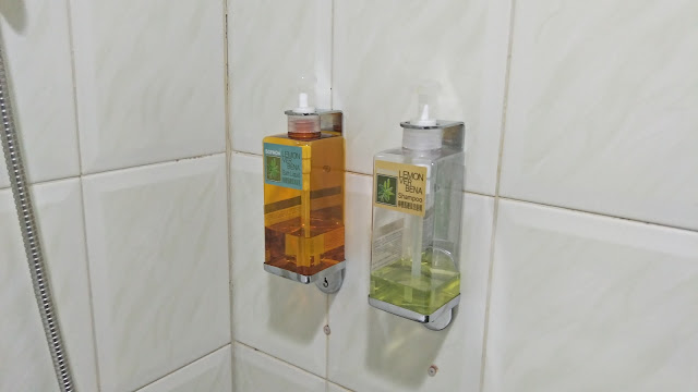 ▲毛巾與備品都提供一次性使用,只有提供大浴巾,洗髮精與沐浴乳為大瓶裝掛在牆上。