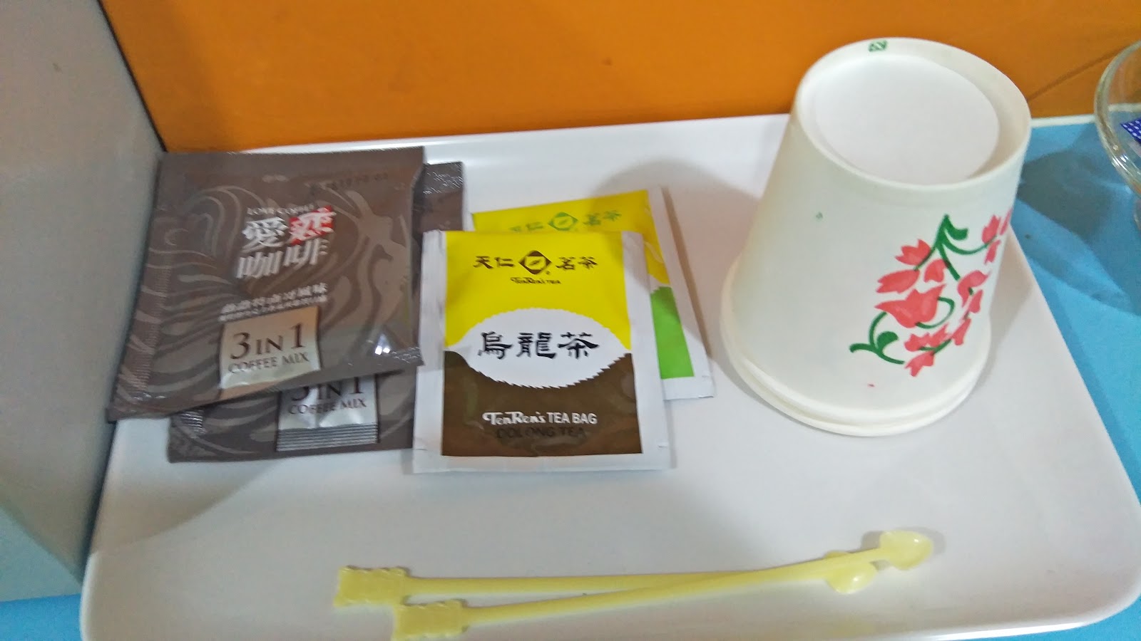 ▲提供咖啡與茶,杯子是用免洗杯。有許多小型旅店因衛生改用免洗杯,