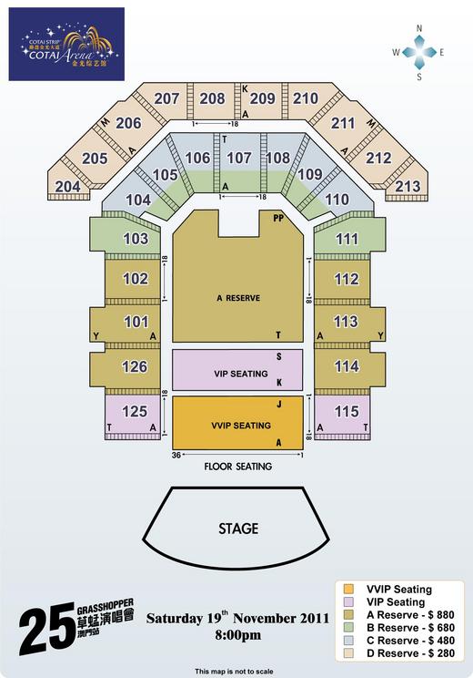 座位圖如圖所示,請參考。澳門場售票的購票僅能選票價區,不能自己選位,位子是由票務系統自己按先後訂位順序出售的。所以早買的人還是有好處,位子一定會比較前面。但大家最想的,還是想要買那幾區VIP與VVIP的非售票區的位子吧!