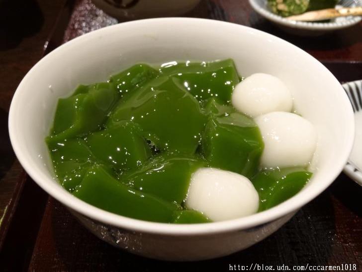 抹茶Tea Jelly與白玉的特寫。Tea Jelly的顏色非常翠綠漂亮!白玉就是我們的湯圓啦!口感軟Q有彈性。旁邊那一盤冰淇淋、紅豆與甜栗子(這三個真的是超甜美的啦!),隨你搭配食用喔!