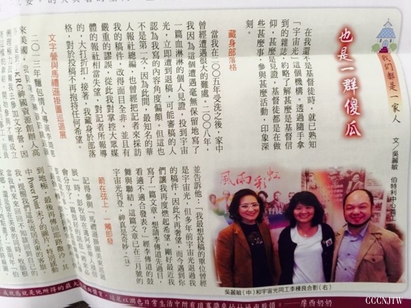 自2013年第一次參加神國資源KRC舉辦的文字營之後,個人總共參加了四次,其中兩次是在臺灣宇宙光參與,而會開始參加卻是 臺灣第一個基督徒高長的後代 《標竿人生》的翻譯,KRC神國雜誌創辦人楊高莉理親自來家裏對麵包情人導演李靖惠進行專訪時,鼓勵我參加文字營的,那年正是我答應神走出教會,立即開始有人找我在教會以外ㄧ起服事的第一年。