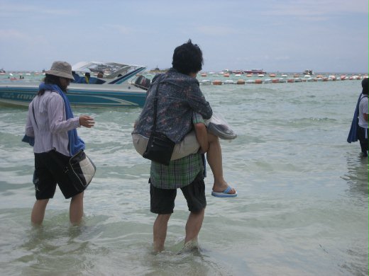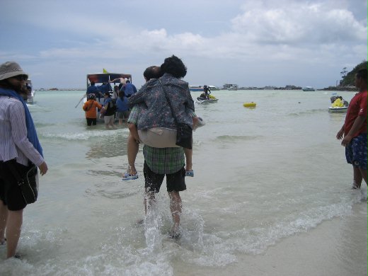 太太的腳在玩拖曳傘時不小心磨破皮,先生貼心的在上下船時,背著心愛的老婆,深怕傷口碰到海水而發炎,先生笑說好久沒背了!