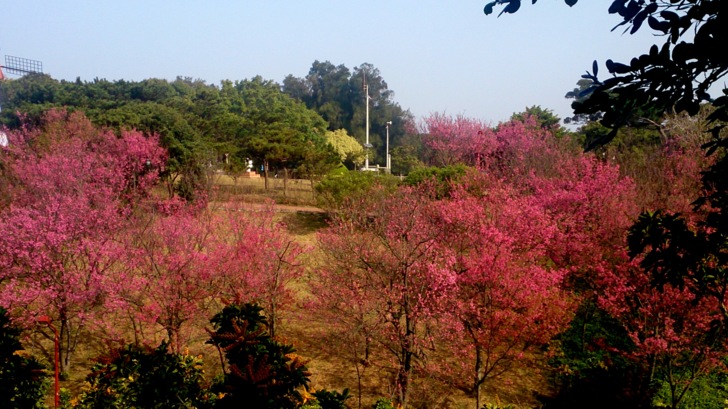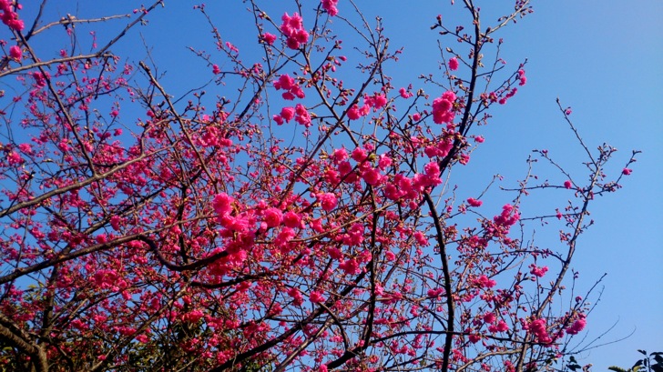 ↑林口竹林山寺前盛開的櫻花,是大年初一的獻禮,也是新春的開端。