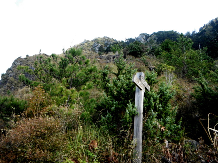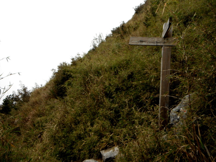 0805前峰登山口(H2875m)。指標左上往前峰800m,旁邊有簽字筆寫2~3h,路ㄟ會心莞爾。這800m不是普通的陡,路ㄟ上次造訪這裡時也吃足苦頭,不過倒不用花這麼多的時間吧!取左上行,開始陡上。頗大的落差,只能手腳併用攀登。