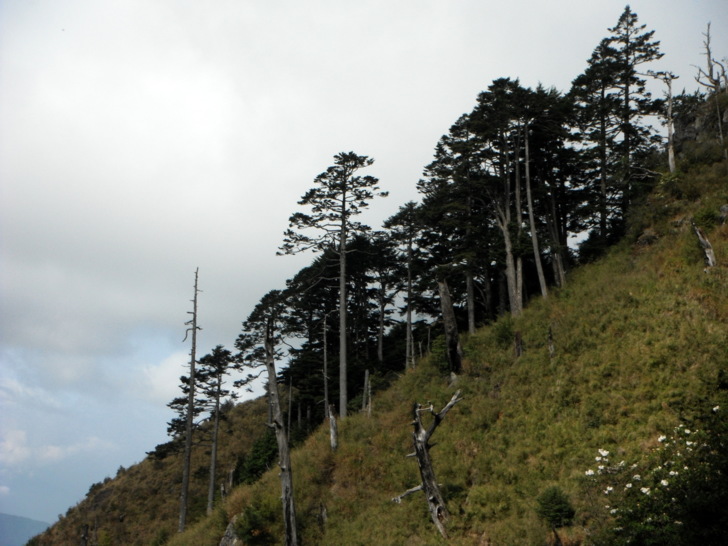 0742出發續行。平緩坡度,走來輕鬆,高山風光逐漸浮現,路旁高山杜鵑已含苞,再過一、二週該會有滿山杜鵑可賞吧!