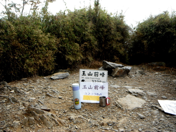 基點周邊箭竹已比以前高很多,展望不算優,拍完登頂照後,環顧四週,霧鎖玉山主、西峰,毫無展望可言,讓路ㄟ有些失望。下裝備煮食午餐。一邊煮食,一邊等候,期待會有片刻撥雲見山容的時間。可惜路ㄟ的願望並沒有實現,相反的,雲層飛快下降,路ㄟ用完午餐,泡完咖啡時,路ㄟ已在雲霧中,只好收拾裝備準備下山。