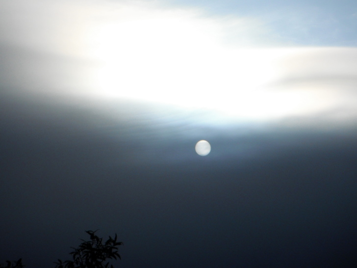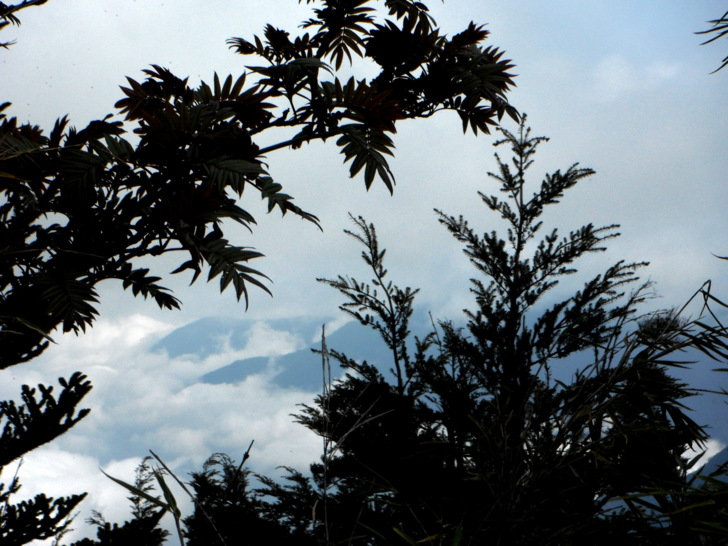 0637大鐵杉叉路(H2730m)。右往鹿林山莊,取左緩下。幾個曲折,已可見前峰身影,在雲層紛擾中時隱時現,山谷有美麗的雲海,太陽在雲霧的圍繞下,竟如皎月透白,景色不俗,拍照慢行。行進中,接駁車經過,登主、北峰的山友還是比路ㄟ快一步到登山口。