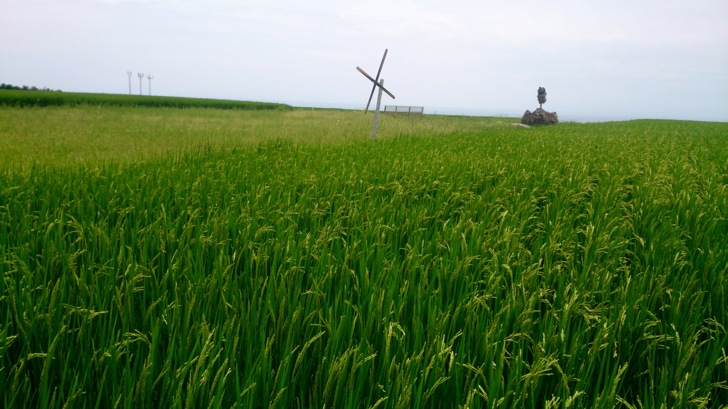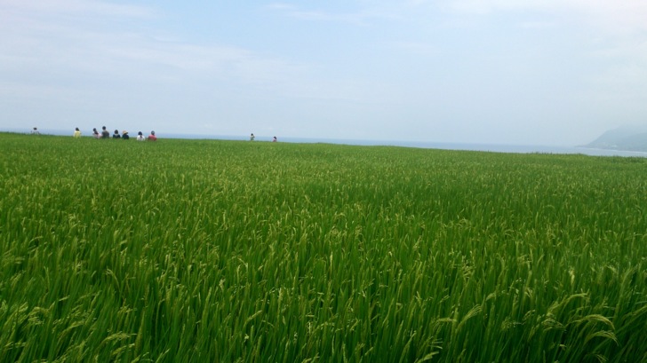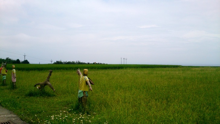 ↓以前匆匆過,從沒注意到在花蓮葛瑪蘭部落前的這片美麗稻園,油綠綠的田埂,逗趣的稻草人,晴空交織的湛藍海洋,形成一幅美麗的圖畫,路ㄟ停車欣賞,有一種心曠神怡的快感。